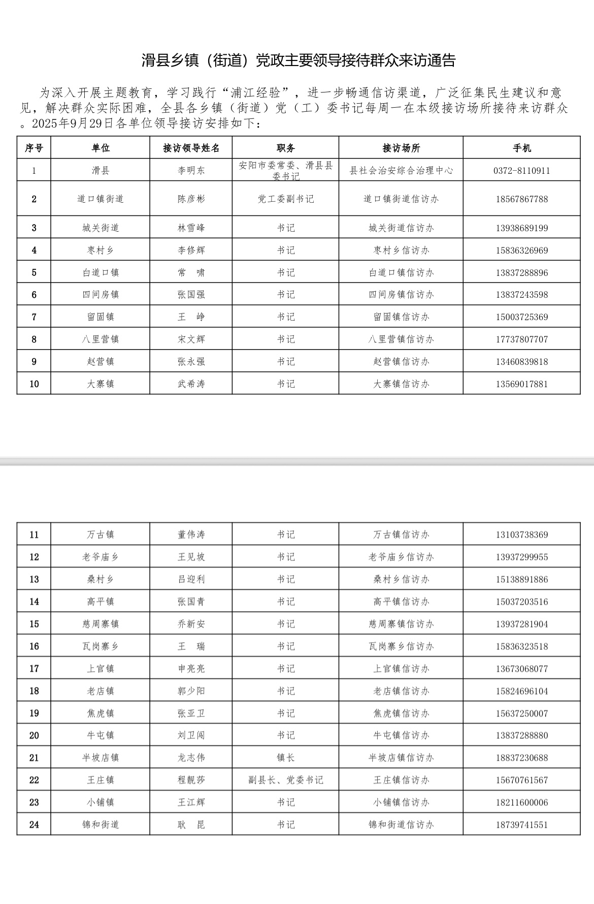 9月29日滑县乡镇(街道)党政主要领导接待群众来访通告