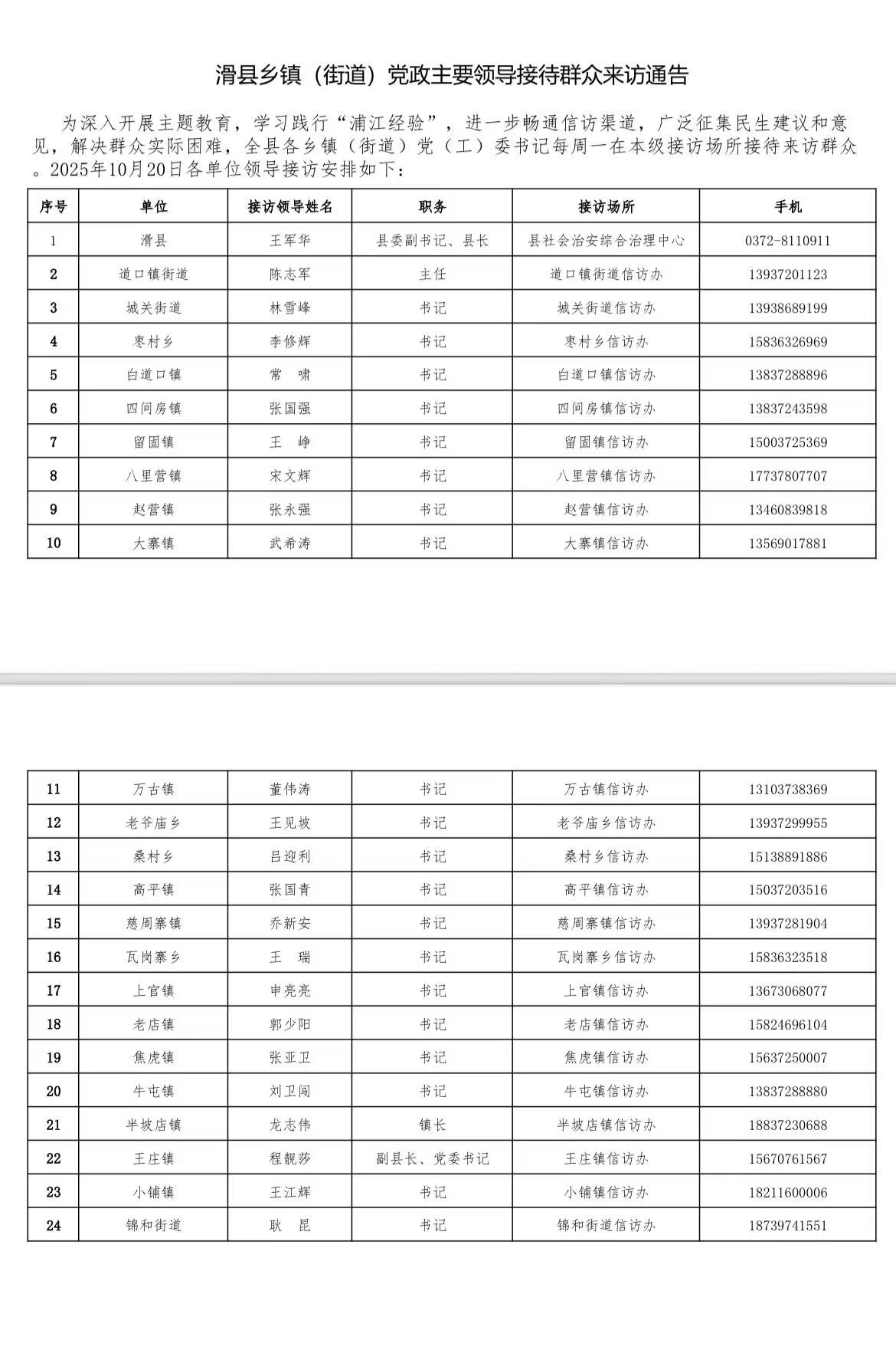 10月20日滑县乡镇(街道)党政主要领导接待群众来访通告