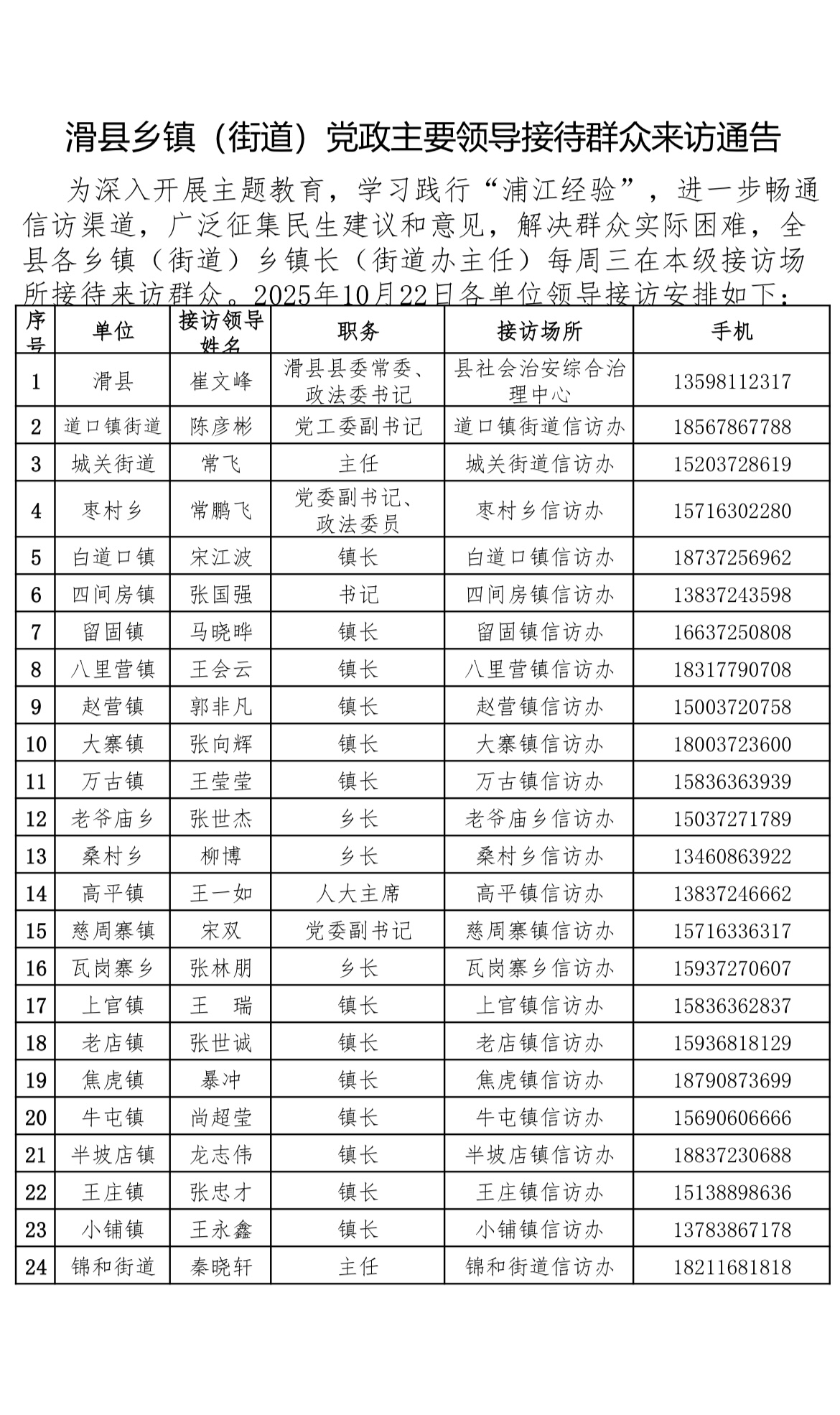 10月22日滑县乡镇(街道)党政主要领导接待群众来访通告