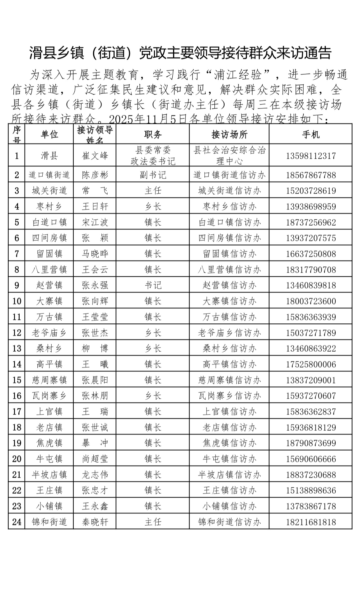 11月5日滑县乡镇(街道)党政主要领导接待群众来访通告
