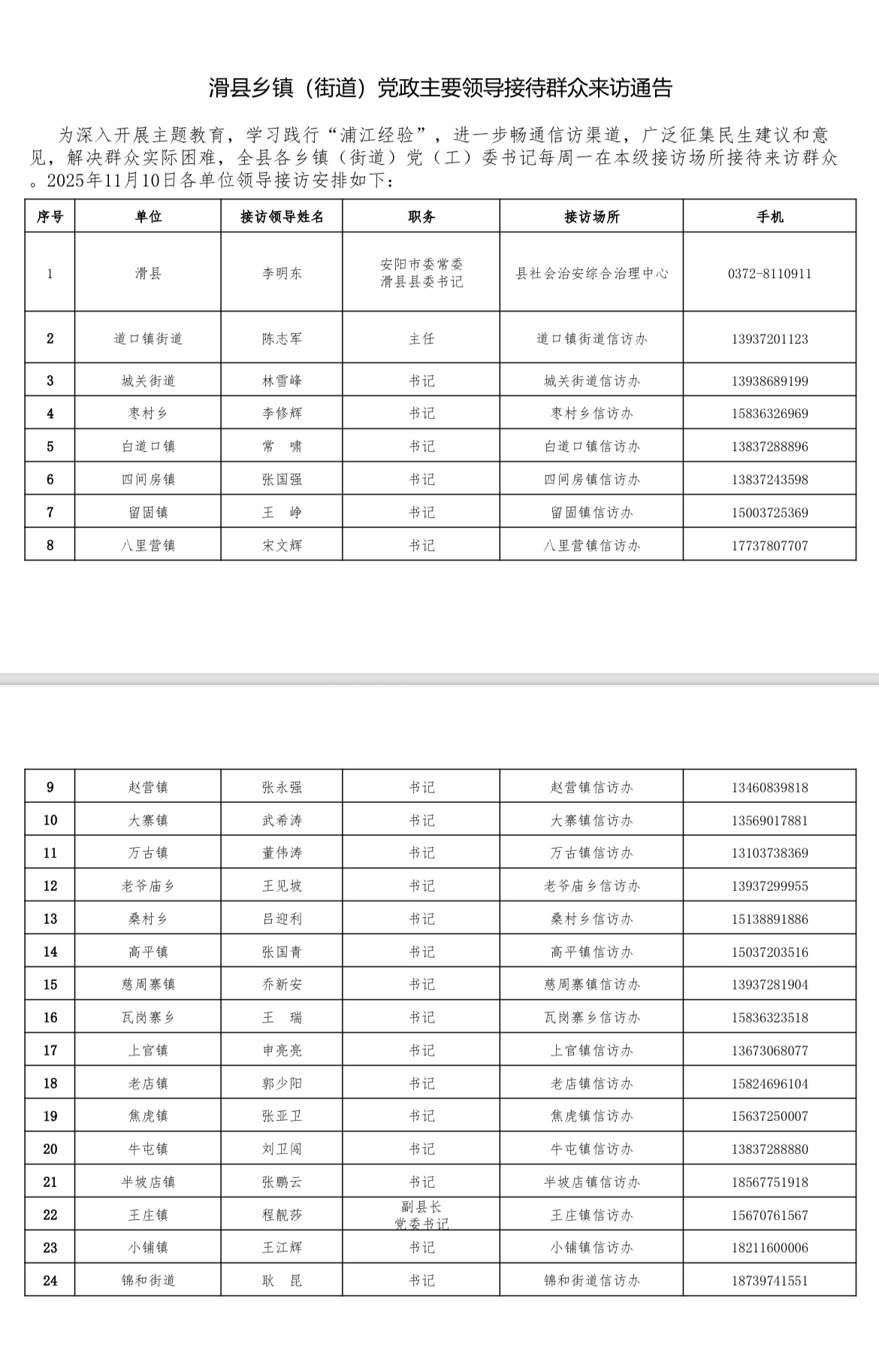 11月10日滑县乡镇(街道)党政主要领导接待群众来访通告