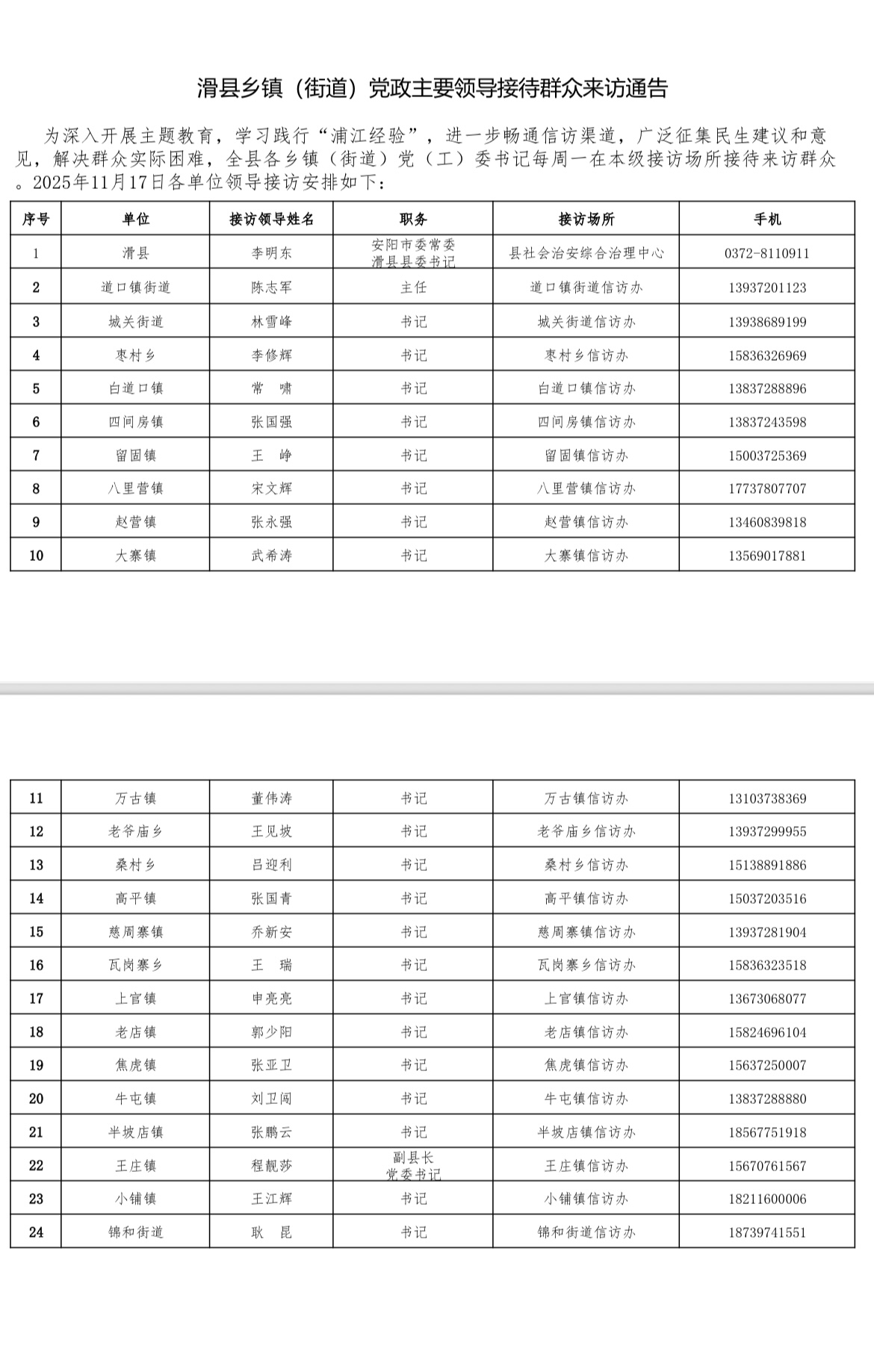 11月17日滑县乡镇(街道)党政主要领导接待群众来访通告