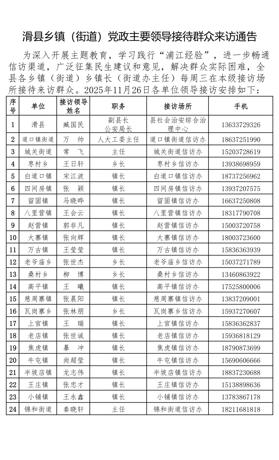 11月26日滑县乡镇(街道)党政主要领导接待群众来访通告