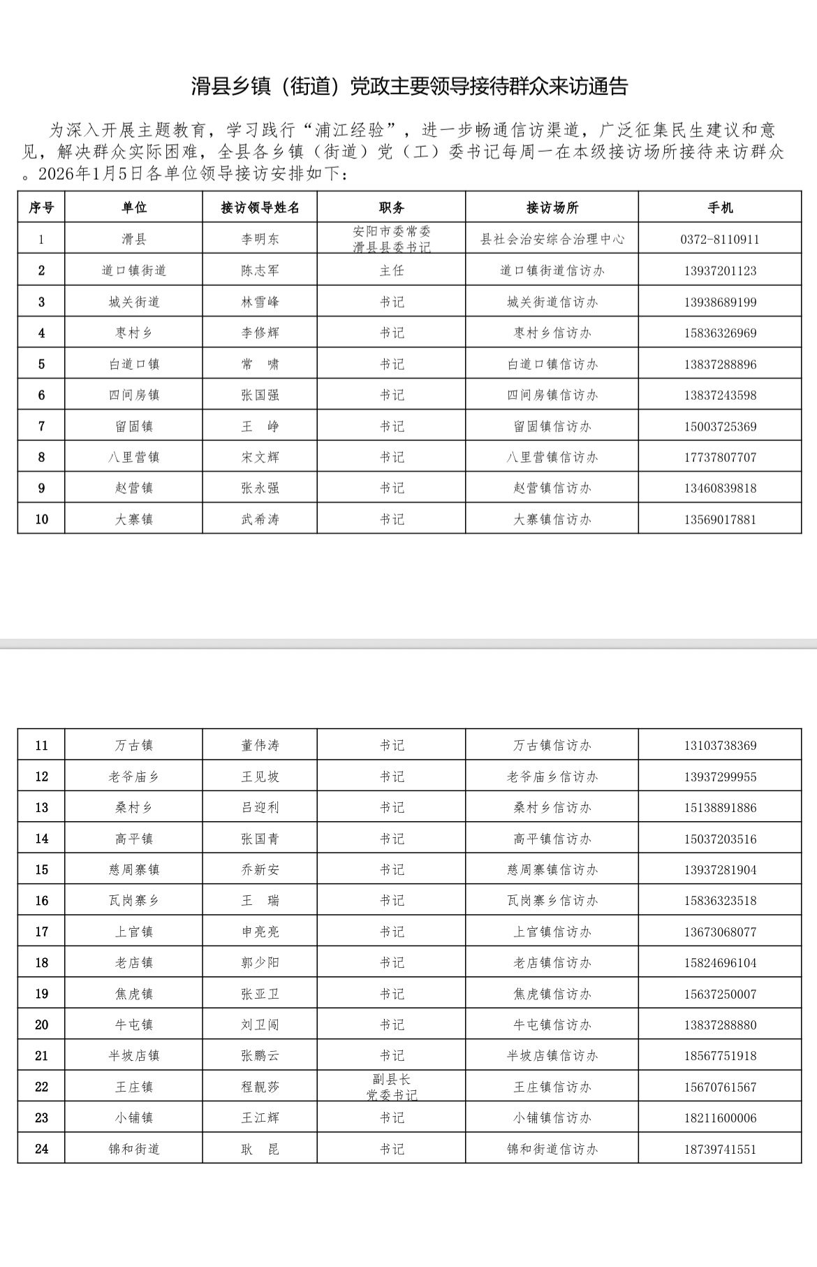 1月5日滑县乡镇(街道)党政主要领导接待群众来访通告