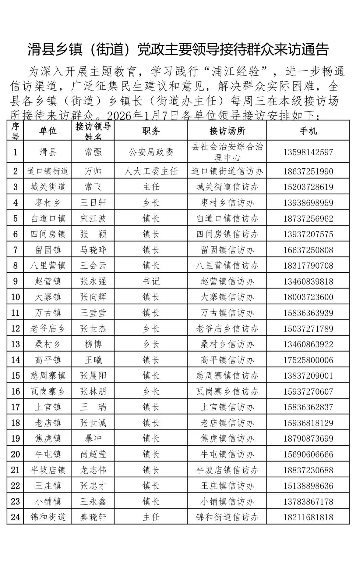 1月7日滑县乡镇(街道)党政主要领导接待群众来访通告