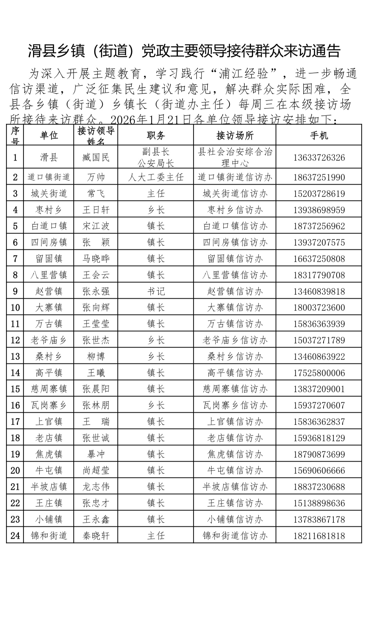 1月21日滑县乡镇(街道)党政主要领导接待群众来访通告
