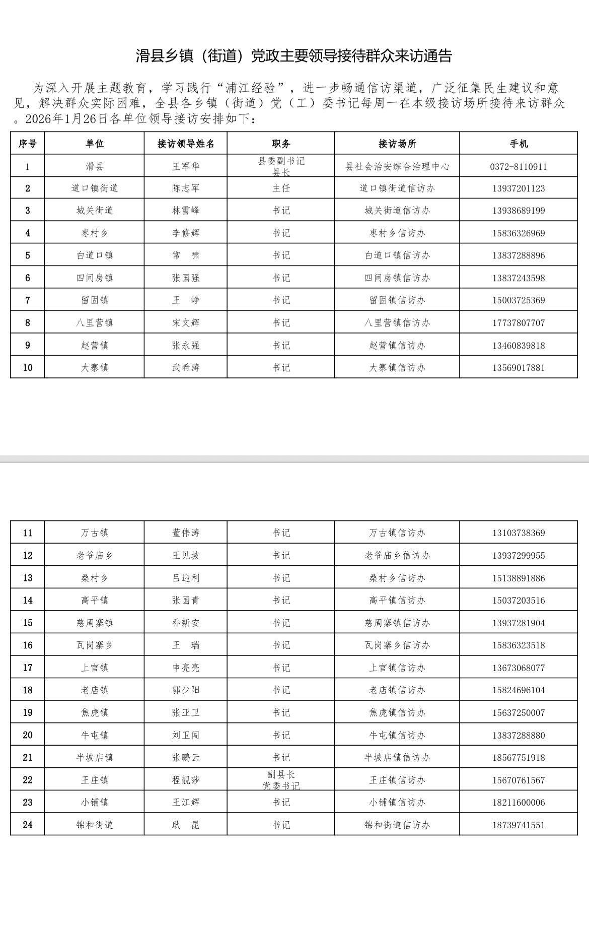 1月26日滑县乡镇(街道)党政主要领导接待群众来访通告