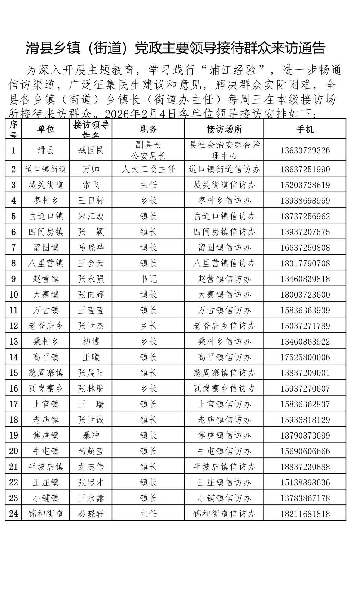 2月4日滑县乡镇(街道)党政主要领导接待群众来访通告