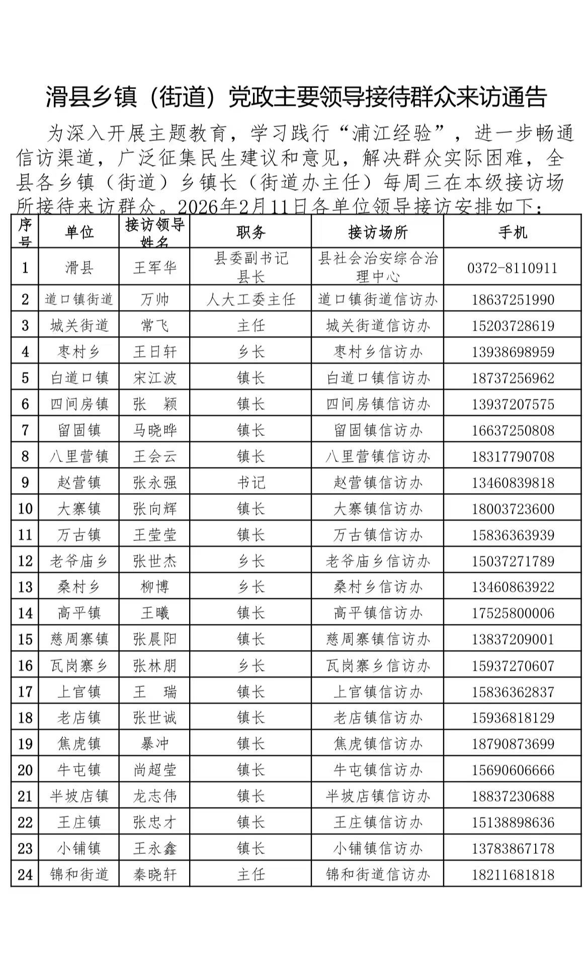 2月11日滑县乡镇(街道)党政主要领导接待群众来访通告