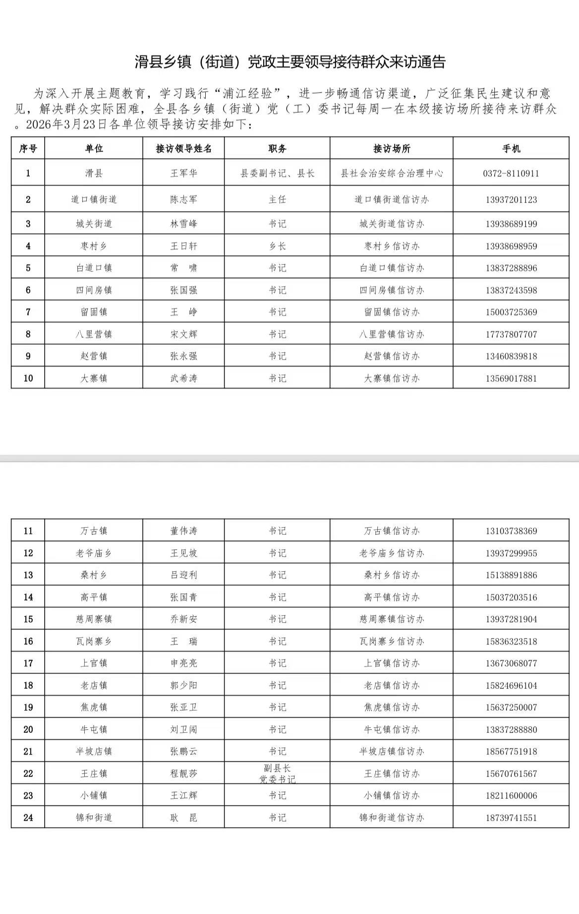 3月23日滑县乡镇(街道)党政主要领导接待群众来访通告