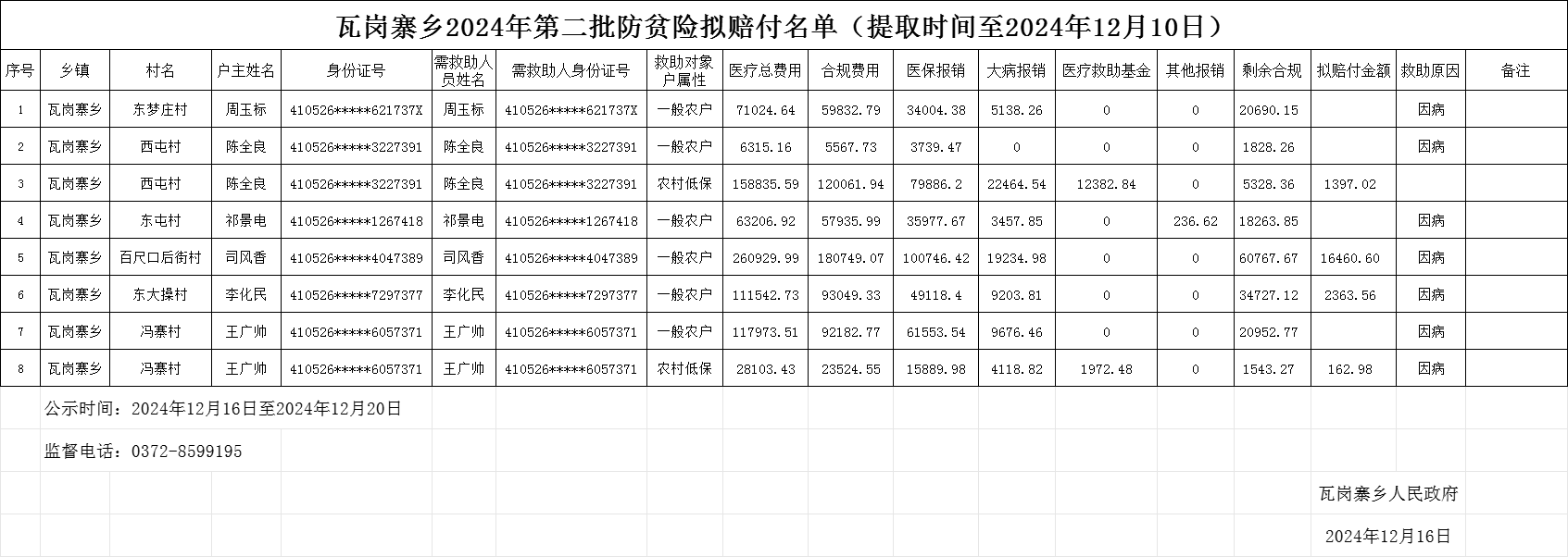 瓦岗寨乡2024年第二批防贫险拟赔付名单(提取时间至2024年12月10日)