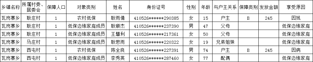 经个人申请、入户调查、民主评议、乡审核,2024年10月瓦岗寨乡农村低保、低保边缘人员拟新增人员如下,请大家监督。