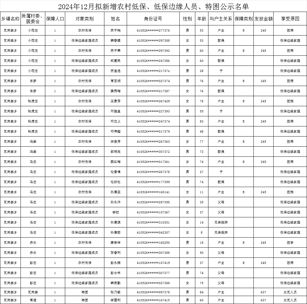 瓦岗寨乡2024年12月拟新增农村低保、低保边缘人员、特困公示名单
