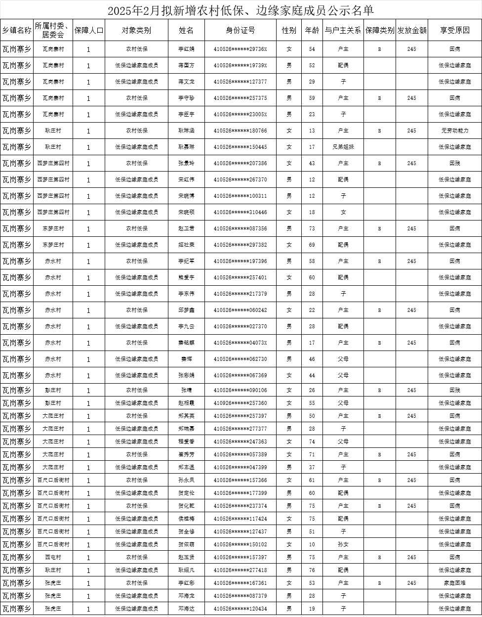 经个人申请,瓦岗寨乡政府入户调查、审核,现将瓦岗寨乡2025年2月拟新增低保及边缘家庭名单予以公示,请大家监督。